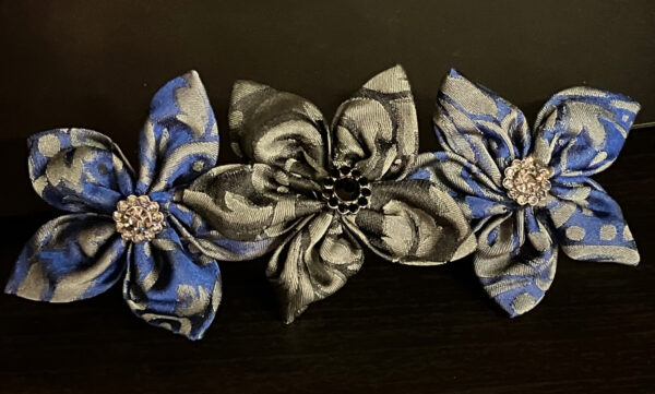 Chaque fleur est réalisée à la main et ornée d’un coeur bijou, noir ou blanc. Les fleurs sont en tissu damassé 100 % polyester. Ce tissu damassé recouvre la barrette. Et les fleurs sont cousues dessus. Comme cela, la fixation est à l’épreuve des usages et du temps.