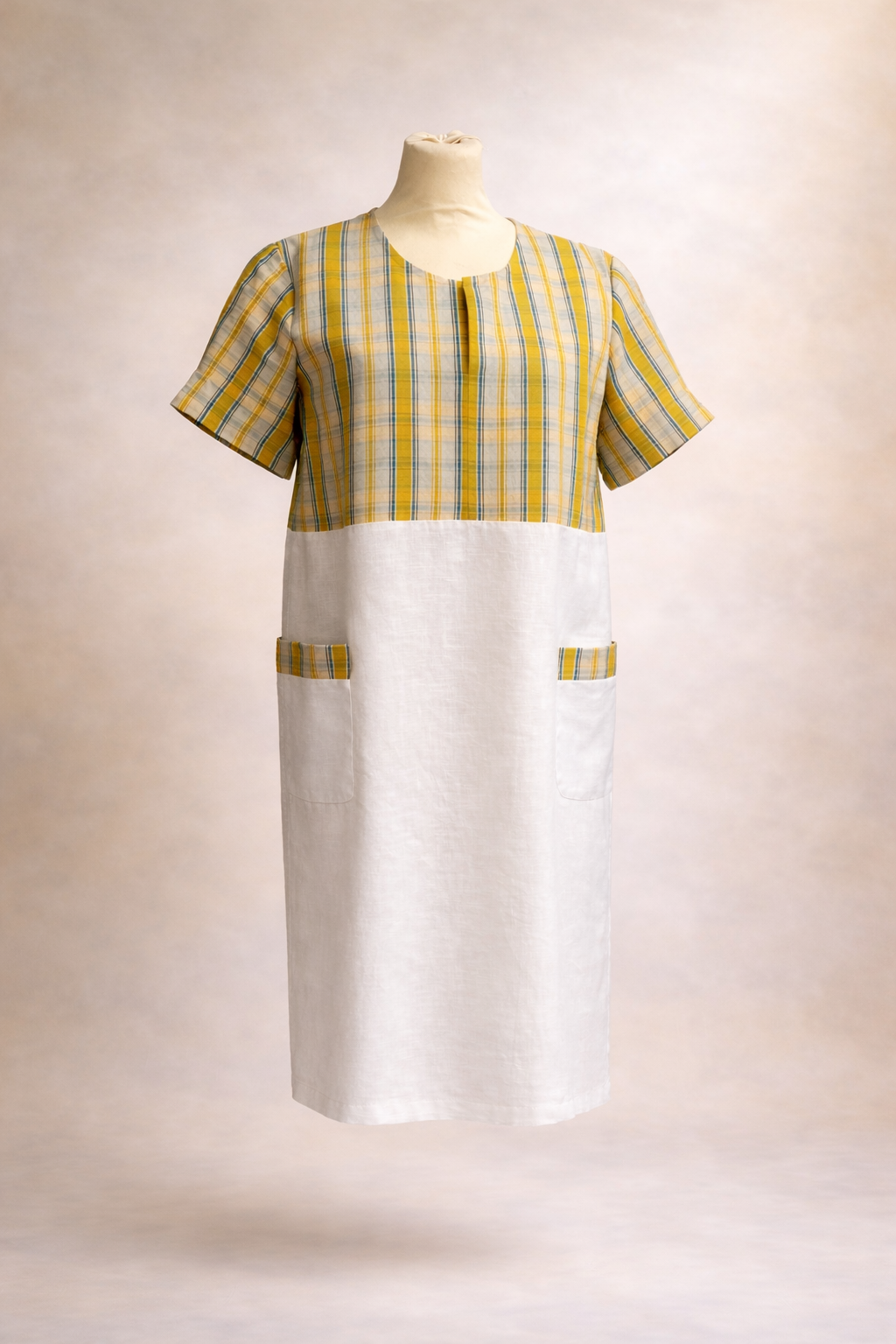 Lisel kelsch jaune s’orne d’un joyeux kelsch jaune (55 % lin, 45% coton) allié à un corps de robe en 100 % lin.